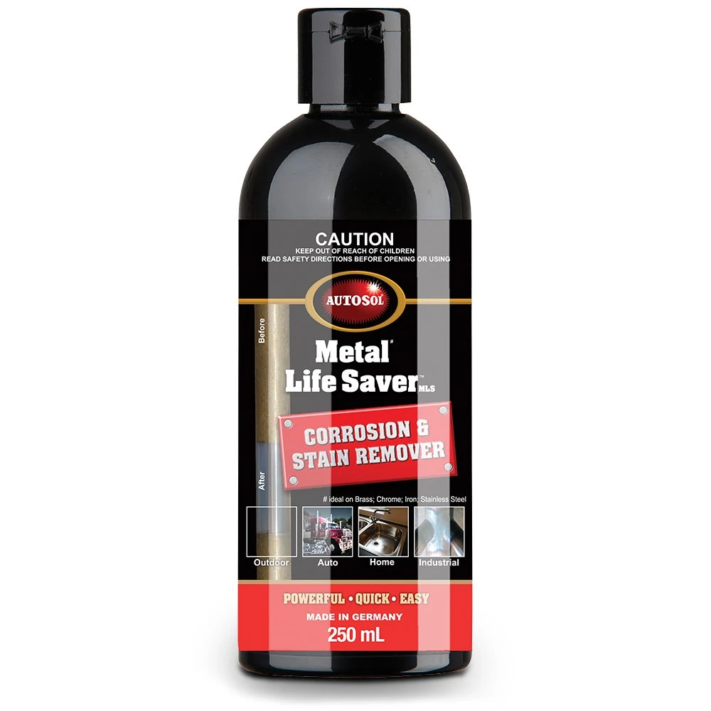 Autosol Metal Life Saver is an industrial-strength corrosion and stain remover. Modeled off a pickling agent, it has been modified to be people-friendly whilst still amazingly effective. The 250ml bottle is ideal for use on all heavily corroded or stained stainless steel, chrome, brass, copper and more. MLS will bring the corroded surface back to a brand new finish but slightly dull and unprotected.