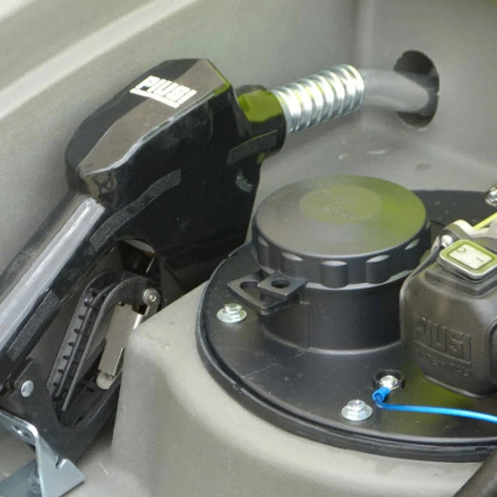 Piusi 12v 45L/min pump, 6m of 3/4″ delivery hose with auto shut off nozzle, heavy-duty rotomolded tank with 15-year warranty, double-hinged lock-able pump cover, protected tank breather system, pump bolted to a large removable aluminum lid, 4m battery cables, anti-static earth strap, integrated lifting handles.
