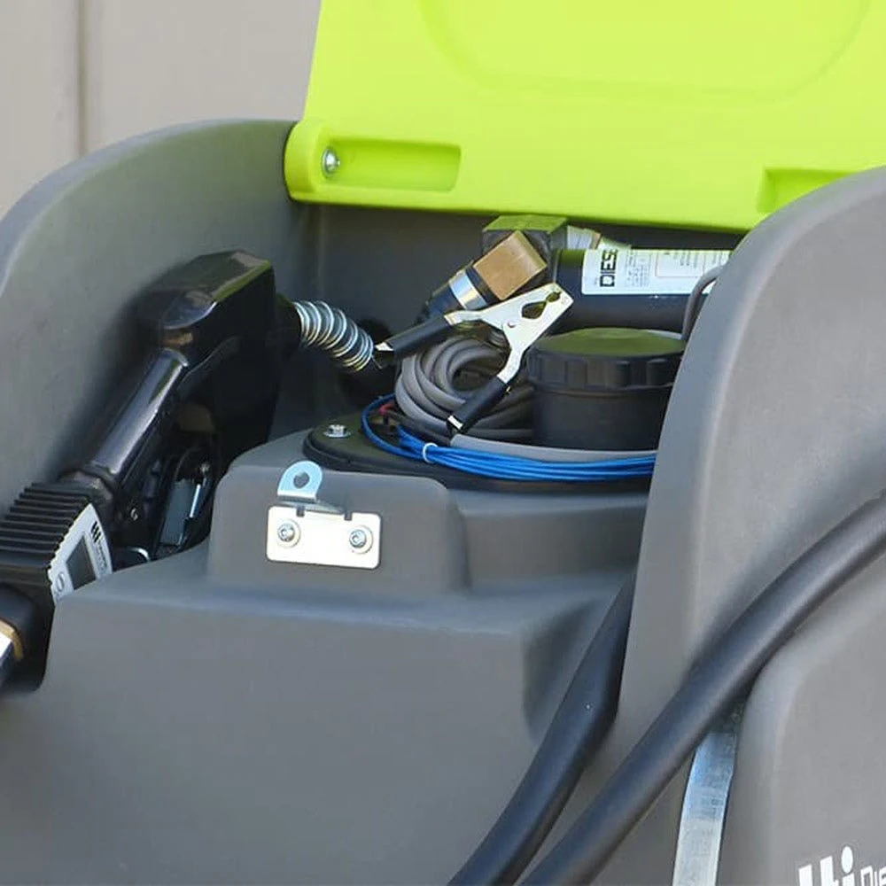 Piusi 12v 45L/min pump, 6m of 3/4″ delivery hose with auto shut off nozzle, heavy-duty tank with drain & 15-year warranty, double-hinged lock-able pump cover, protected tank breather system, pump bolted to a large removable aluminum lid, 4m battery cables, anti-static earth strap, integrated lifting handles.